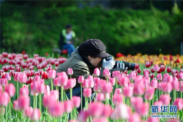 4月24日,一名摄影爱好者在北京交通大学校园内拍摄盛开的郁金香。新华社发(杨素平 摄)