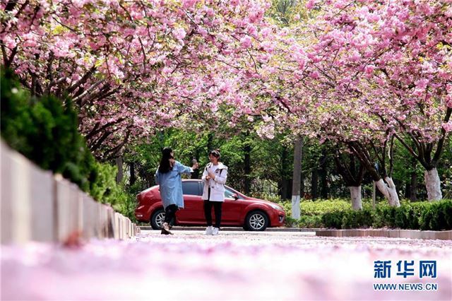 4月24日,在青岛西海岸新区山东科技大学校内,学生徜徉在繁花盛开的樱花大道。新华社发(王培珂 摄)