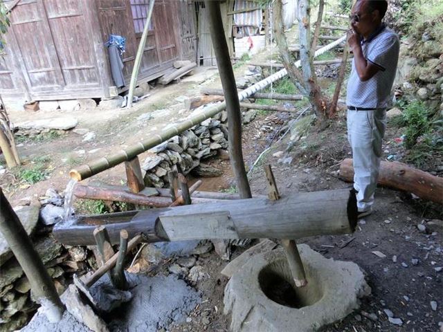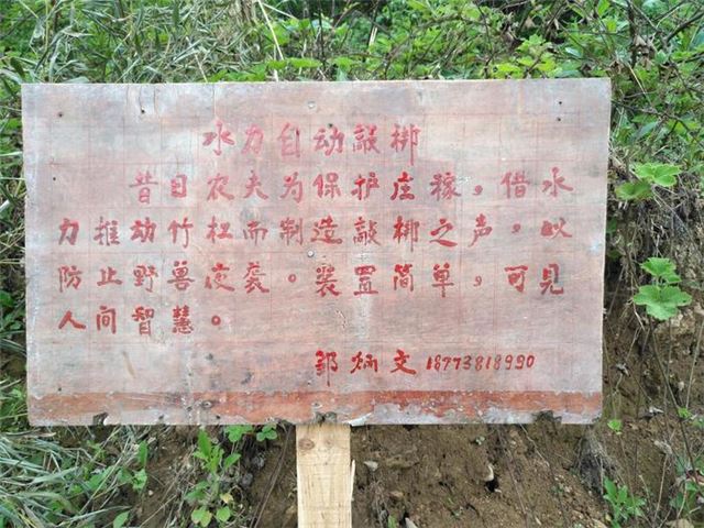 过去山区人民为了保护自己地里种的庄稼,就在有水的地方制作了这种简易的自动敲梆装置来驱赶野兽。夜深人静时,野兽听到敲梆的声音便不敢前来觅食。这个简单的装置,足以说明古代劳动人民的聪明才智。