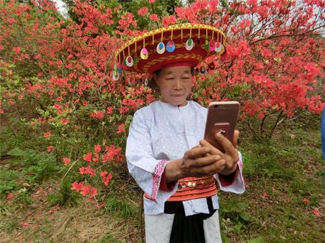 在映山红树下嬉戏的孩子和自拍的奶奶