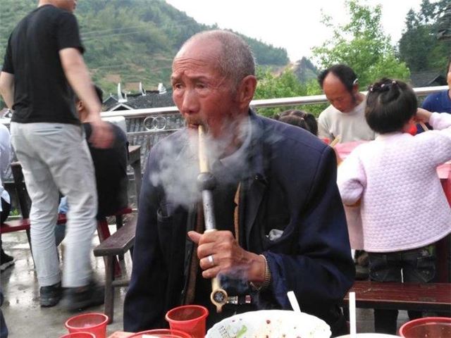 晚饭和这位大爷坐一桌,饭后大爷掏出一根烟筒,怡然自得吸起烟来。