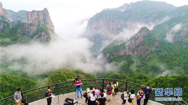 5月1日,游人在浙江省仙居县神仙居景区游览。当日,雨后的神仙居景区云雾缭绕,山峦若隐若现。新华社发 王华斌 摄