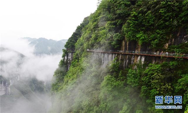 5月1日,游客在湖南省吉首市的悬崖栈道上游览。当日,吉首市雨过天晴,山区云雾缥缈,变幻多姿。新华社发 姚方 摄