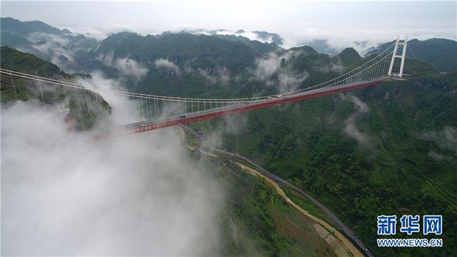 5月1日,湖南省吉首市矮寨大桥周边云雾缭绕。当日,吉首市雨过天晴,山区云雾缥缈,变幻多姿。新华社发 龙恩泽 摄