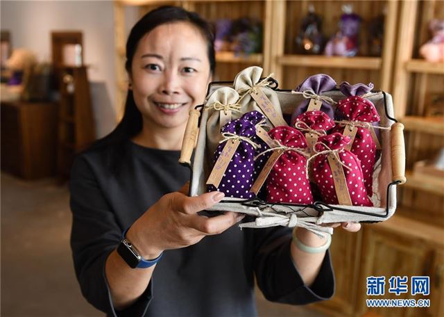 5月10日,在观音殿村一家文创店铺内,工作人员展示薰衣草制品。新华社记者 季春鹏 摄