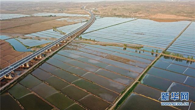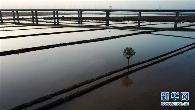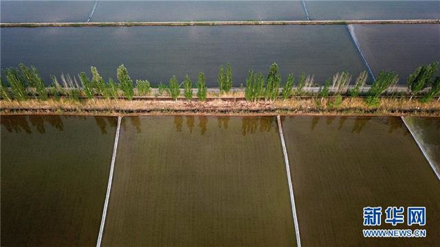 近日,宁夏黄河灌区百万亩水稻种植区进入插秧季节,黄河岸边,块块稻田水满欲溢,在初夏夕阳的映照下犹如明镜,一派生机盎然的景象。