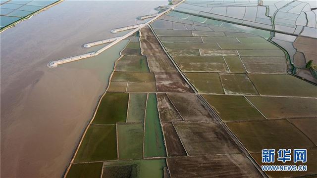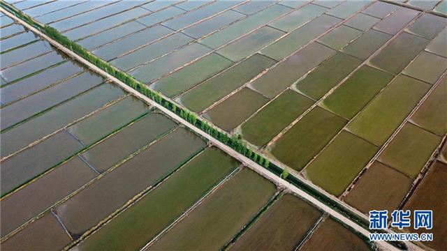 这是5月13日无人机拍摄的位于宁夏银川市境内黄河岸边的稻田。新华社记者 王鹏 摄