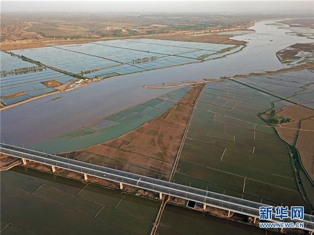 这是5月13日无人机拍摄的位于宁夏银川市境内黄河岸边的稻田。