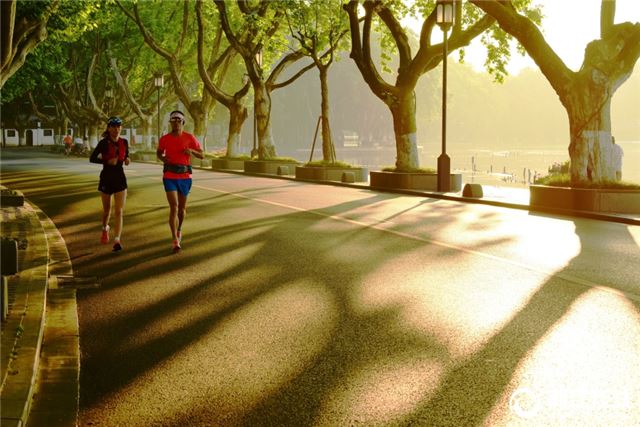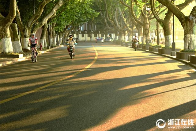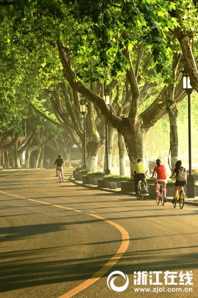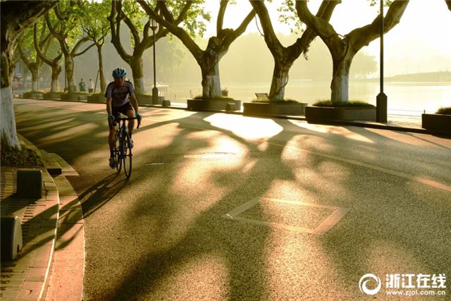 5月16日,晨光中的西湖边,光影斑驳。杭城持续高温,热力不减。(浙江在线拍友 里尔 摄)