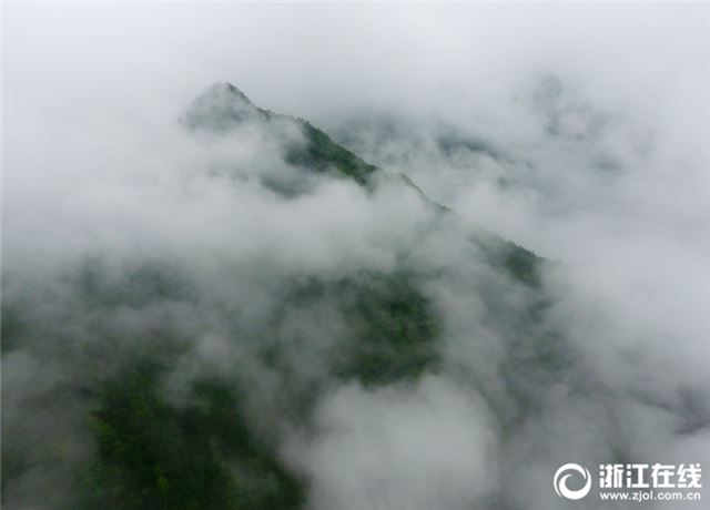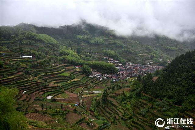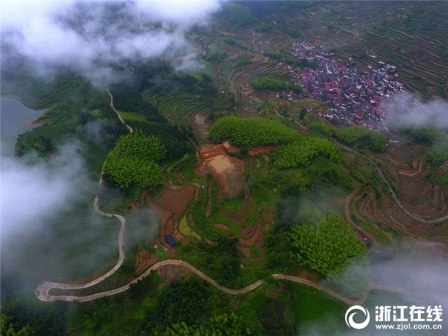 5月21日清晨,雨后海拔千米的武义县新宅镇大莱和坦洪乡上周村,白云绕山岗、梯田披彩妆,景色如画。(浙江在线拍友 张建成 摄)