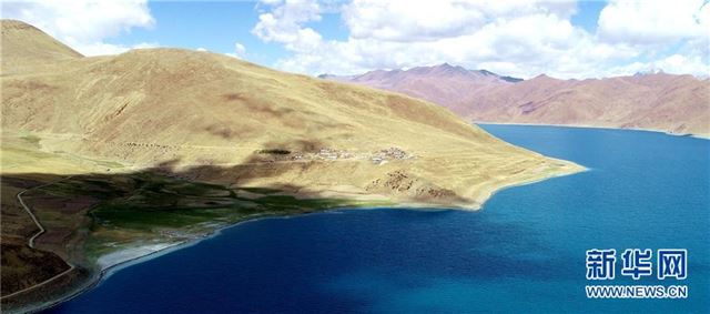 羊卓雍错湖畔的村庄(5月27日无人机拍摄)。羊卓雍错简称羊湖,位于西藏山南市浪卡子县境内,湖面海拔4400多米,其自然景色美丽迷人,每年都会吸引大批游客前来观湖赏景。 新华社记者晋美多吉 摄