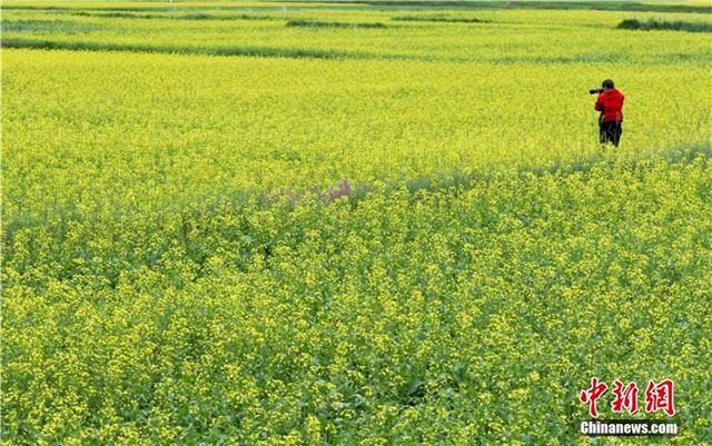 盛放的油菜花与远方的蓝天白云相互映衬,构成一幅美丽的田园画卷。王将 摄