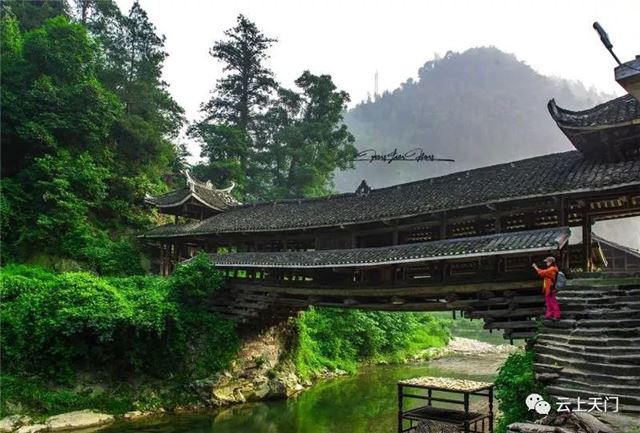 长峰风雨桥历经上百年风雨,仍然屹立不倒。这座特殊建筑全用木头制成,基本没有一个铁钉,以木头互相钳制组装。这是天门百姓智慧的直接象征。在风雨桥上,看见的是历史,是文化。溪流从下穿过,水中河鱼游跃,岸边百姓人家,木屋相望。行走在风雨桥上,感知历史的厚重,眺望情人湖的秀美。