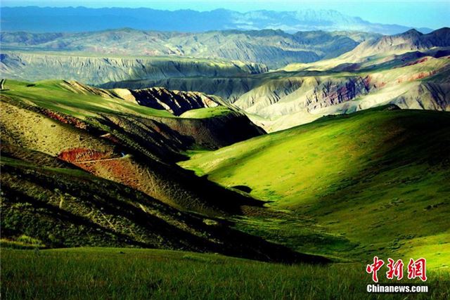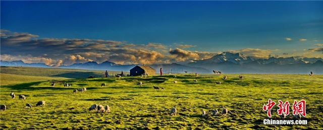 7月12日,祁连山下雨过天晴。甘肃张掖市肃南裕固族自治县皇城镇境内的夏日塔拉草原轻风吹拂,绿色草原随风荡漾,牛羊成群在草地上觅食奔跑。武雪峰 摄