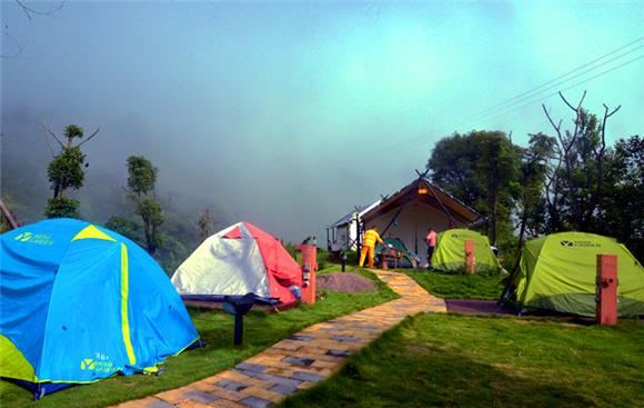 阳光、帐篷、步道、草地与远处的晨雾形成了鲜明的对比。古剑山国家标准示范帐篷露营地开始了他们忙碌的一天。通讯员 孙治波 摄