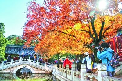 近日,北京地区的红叶进入最佳观赏期。适逢天气晴好,前往各个景区赏红叶的游人众多。28日上午,在香山勤政殿前,一早赶来的人们纷纷举起相机,与美丽的红叶合影。安旭东摄