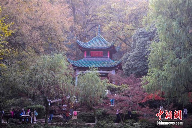 11月28日,长沙市岳麓山风景名胜区的枫树、槭树等树种树叶相继变红,景区内漫山红遍,层林尽染,进入了观赏红叶的最佳时期,市民纷纷来到岳麓山爱晚亭赏红叶。杨华峰 摄