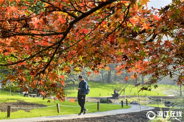 11月29日,杭州太子湾景区秋意盎然,景色醉人,吸引了不少游客前来赏景拍照留影。满园的槭树、红枫四处摇曳,美不胜收。(浙江在线记者 于诗奇 尹海木 冯贺 摄)