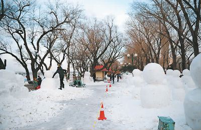 近日,随着哈尔滨进入冰雪旅游季,松花江畔开始建造各式冰雪景观,引来游客合影留念。图为12月17日,雪雕师在松花江畔制作雪雕景观。