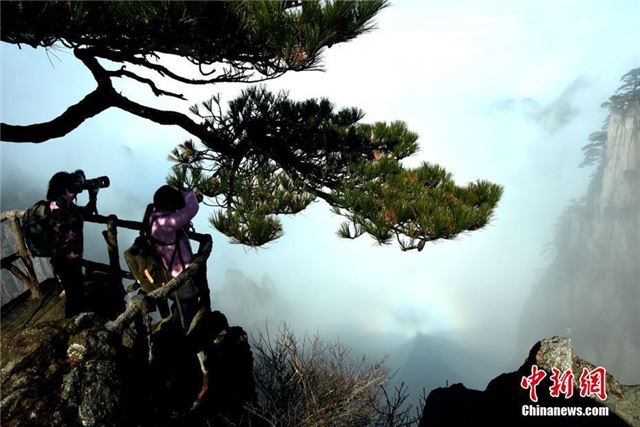 12月20日,安徽黄山风景区出现大面积壮观云海美景与佛光景观。云海奔腾,拍打群峰,卷起千重雾浪,气势恢宏壮观。山谷间的云雾,时而旋转,时而升腾,缭绕峰峦之间,奇松怪石映衬之下,幻若仙境。当日云海持续时间长,范围广,游客漫步黄山,走到任何一个景点,眺望群峰,都有别样的景致。与云海一同出现的还有佛光景观,在云雾之中,一团五色光晕,时隐时现,甚是奇妙,吸引了许多摄影爱好者驻足抓拍。文/刘浩 图/王辉