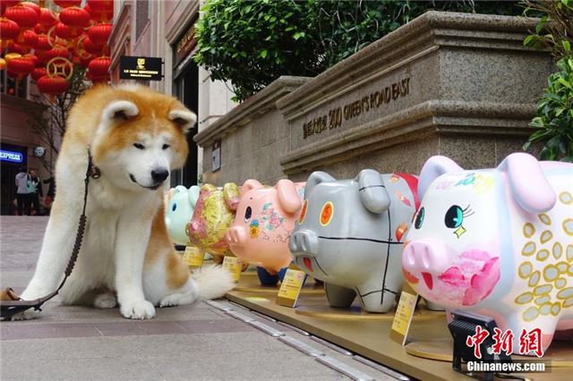 灵感来自“猪仔钱罐”的66只主题艺术猪由香港大专、中小学生及多名本地艺术家设计及参与制作,主办方希望通过艺术猪巡回展览,加深市民对存款保障计划的认识和了解。图为一只秋田犬与艺术猪“对视”。
