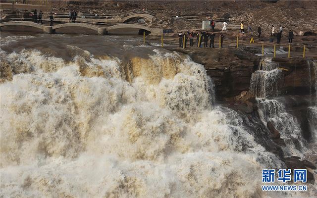 3月3日,游客在黄河壶口瀑布景区游览。近日,随着气温回暖,受上游融冰开河速度加快影响,黄河壶口瀑布水量增大,气势磅礴。 新华社发(吕桂明 摄)