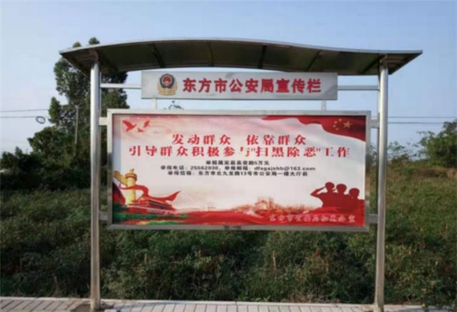 为深入贯彻落实中央、省、市关于开展扫黑除恶专项斗争的决策部署,在全市范围内营造浓厚的扫黑除恶舆论氛围,充分调动全民参与扫黑除恶专项斗争的积极性和主动性,海南省东方市公安局在城区及各乡镇主要街道、人员密集的地方设置扫黑除恶宣传栏,以通俗易懂的文字表述扫黑除恶专项斗争工作内容,公布扫黑除恶举报电话,方便群众了解和举报,把市委、市政府扫黑除恶专项斗争的决策部署、决心态度广泛宣传到千家万户,在全市形成人人知晓、人人参与的浓厚氛围,为全市经济社会发展提供一个安静和谐的良好环境。(彭珊珊 陈建峰)