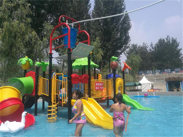 水上乐园以浅水游泳及娱乐设施为主,儿童区水深30-40公分,内设水上滑梯、喷水蘑菇、水上跷跷板等娱乐设施;成人区水深60-80公分,娱乐设施包括旋转木马、海盗船、鲤鱼跃龙门、小火车、机器人、挖掘机、蹦床等。休闲垂钓园设有钓位200个。水上乐园园区内配有休闲座椅、淋浴间、公厕等配套设施。