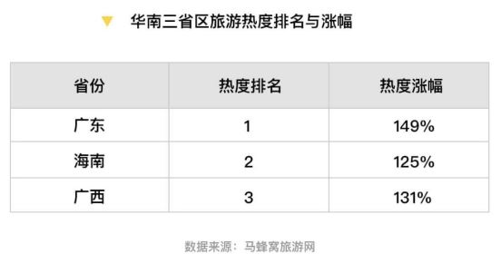 马蜂窝大数据显示,广东省无论是旅游热度还是旅游发展速度,都位居华南地区首位。2018年,广东省旅游热度同比增长149%,马蜂窝旅游研究中心负责人冯饶指出,除了广东传统的旅游项目,2018年港珠澳大桥通车,粤港澳大湾区协同效应,成为广东旅游发展的加速器。