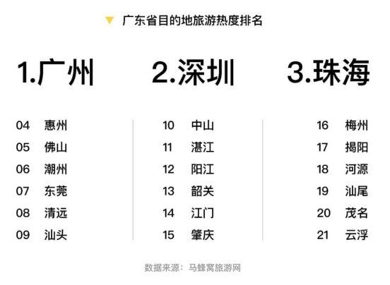 在广东的热门旅游目的地排行榜中,粤港澳大湾区城市群包揽了前五位。马蜂窝大数据显示,广东省最热门的旅游城市分别为广州、深圳、珠海、惠州和佛山。深圳、珠海是面向香港和澳门的重要口岸城市,前往港澳旅游的人群,也往往会在此停留。
