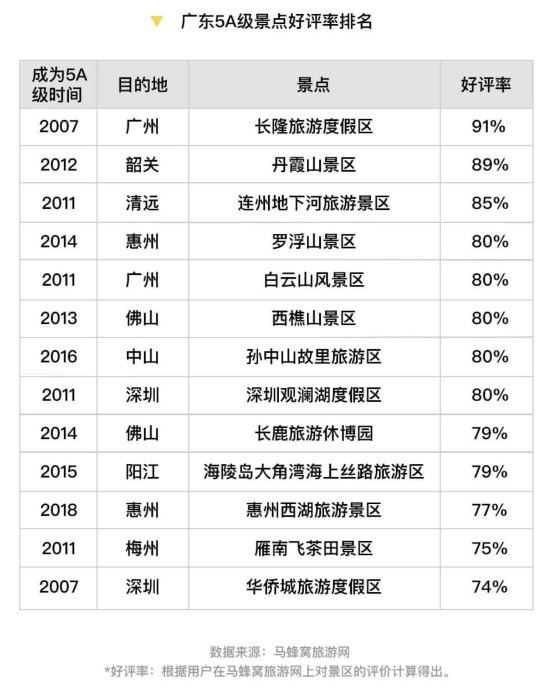 同时,在广东省的13个5A级景区中,广州长隆旅游度假区也是好评率最高的旅游景区,有91%的游客为广州长隆打了五星好评。