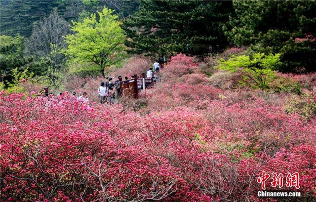 4月20日,游客在龟峰山的杜鹃花海游玩。近日,湖北省麻城市龟峰山的古杜鹃花盛开,大量游客前来赏花观景。中新社记者 张畅 摄