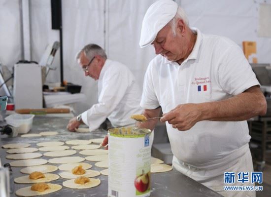 5月11日,在法国巴黎圣母院附近举行的第24届面包节上,面包师制作苹果面包。新华社记者高静摄