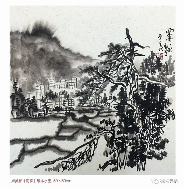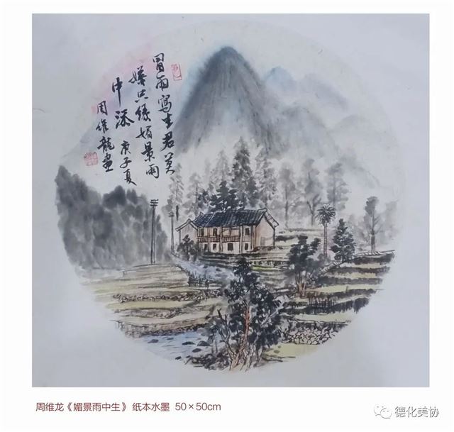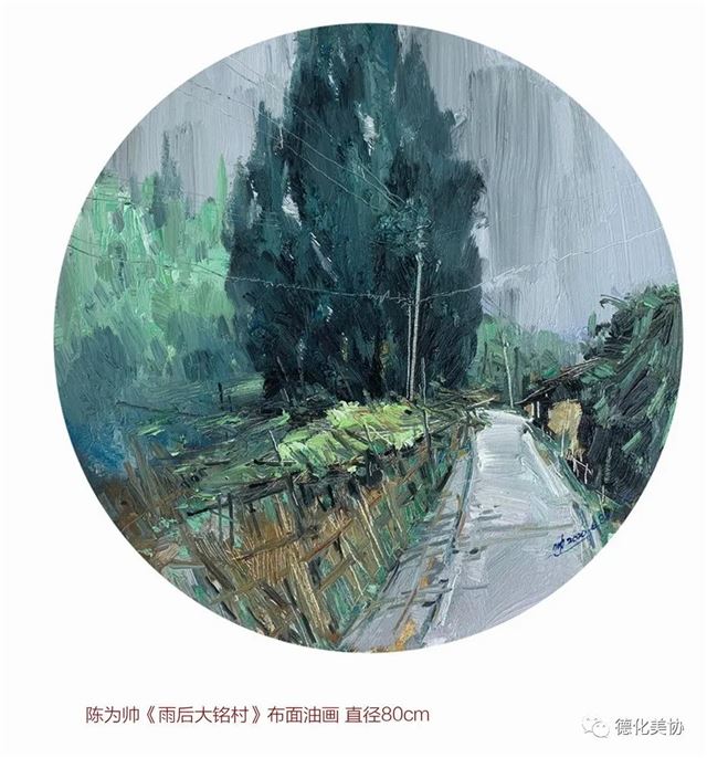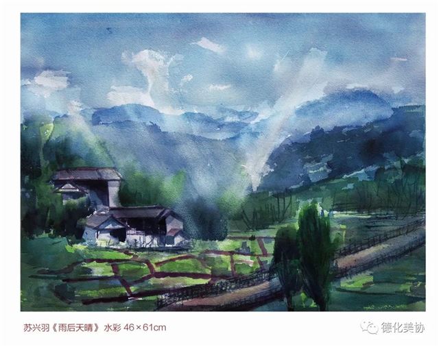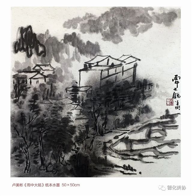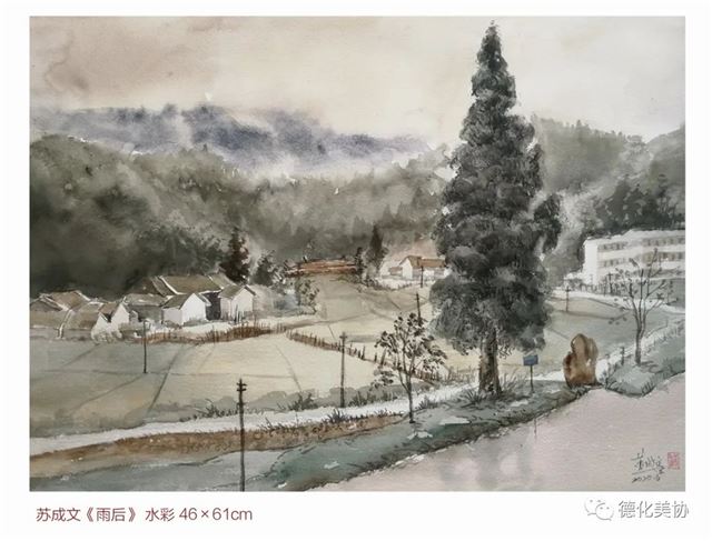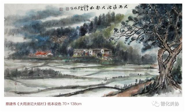 随后,采风写生团散布大铭村四周进行踩点写生。此时,天上又下起大雨来,却不减会员们写生创作的热情。雨中的乡村山色更加的清新媚人,采风写生团立画架在屋檐下、农家阁楼上、祖厝堂内用细腻饱满的笔触将雨雾中大铭村亮丽风景勾勒于纸上。