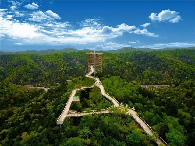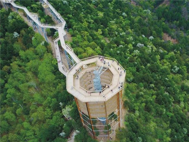 树顶漫步科普塔,全长1250米,设置有三组科普互动平台,两处玻璃景观台,各种飞禽标本,在这里,我们能够立体的看到黄龙山的植物,还能在40米的塔顶,看到黄龙山的地形地貌。
