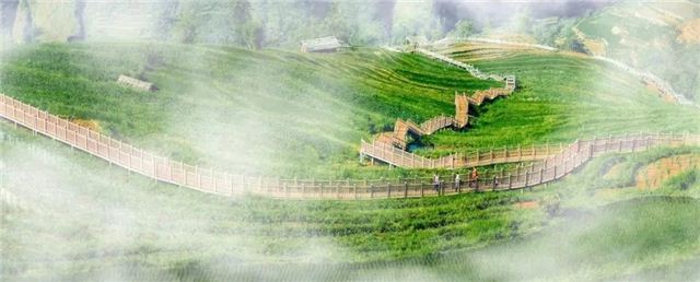 走在梯田间的栈道上,欣赏梯田层层叠叠的翠绿美景,空气清新,一股股清爽的气息从田间散发出来,放眼望去,一大片绿色映入眼帘,让人心旷神怡。