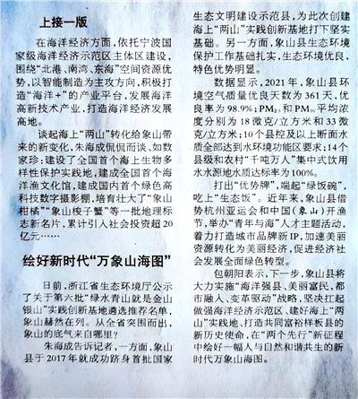 据悉,中国环境报记者雷英杰、黄建华、洪旭朝,近日深入象山,撰写《打造“优势牌”吃上“生态饭”象山打造海上“两山”实践金名片》的新闻报道全文截屏如下: