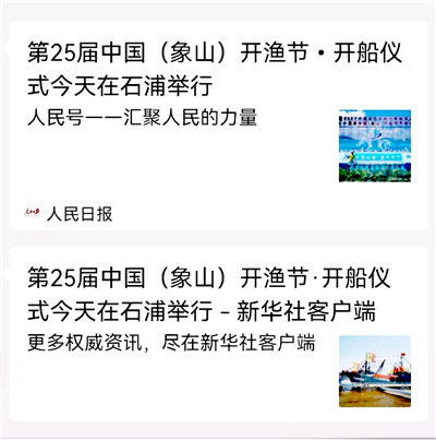 又讯:9月16日,人民日报、新华社发表了洪紫千现场报道《第25届中国(象山)开渔节·开船仪式今天在石浦举行》。(记者:洪斌 图片由记者提供)