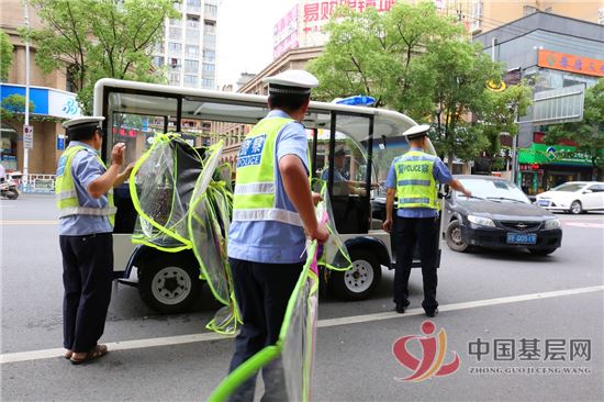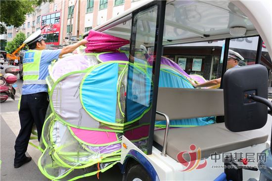 当天,正值上班高峰期,大队民(协)警全员出动,在三清大道、冰溪路、新建路等城区主次干道开展“清伞”行动。行动中,民(协)警严格做到发现一起、查处一起、并予以拆除、收缴。同时,对非法安装遮阳伞的驾驶人耐心讲解交通法规,指出擅自安装遮阳伞的危害,教育引导群众要保护自身安全。