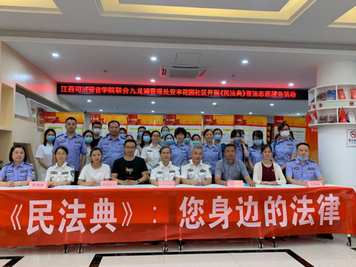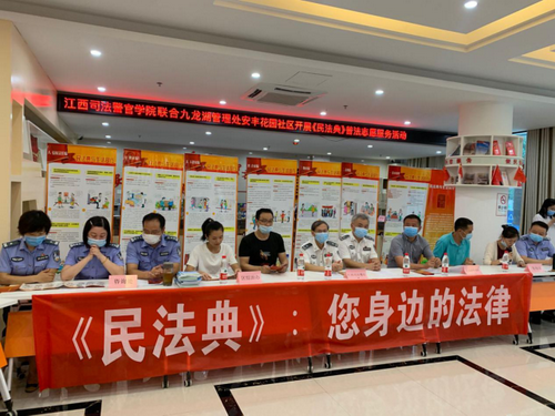 江西南昌讯(记者韩同瑞 通讯员 何劲峰 程小勇)《民法典》是增进人民福祉,维护最广大人民群众根本利益的法律利器,是与人民群众生活息息相关的生活百科全书。《民法典》的实施离不开人民群众的学法、守法、用法,社区是离人民群众最近的地方。为了让广大人民群众了解民法典最新的相关规定,理解到民法典的在公民社会生活中的重大意义。2020年6月30日上午,江西司法警官学院党委委员、副院长唐星带领十余名教授及法律专业老师来九龙湖管理处安丰花园社区开展《民法典:您身边的法律》为主题的普法宣传和法律咨询志愿服务活动,出席此次活动的领导有九龙湖管理处主任赵勇;红谷滩新区综治办刘灿银大队长;九龙湖管理处综治办主任邓玉春;安丰花园社区党支部书记戴冲。