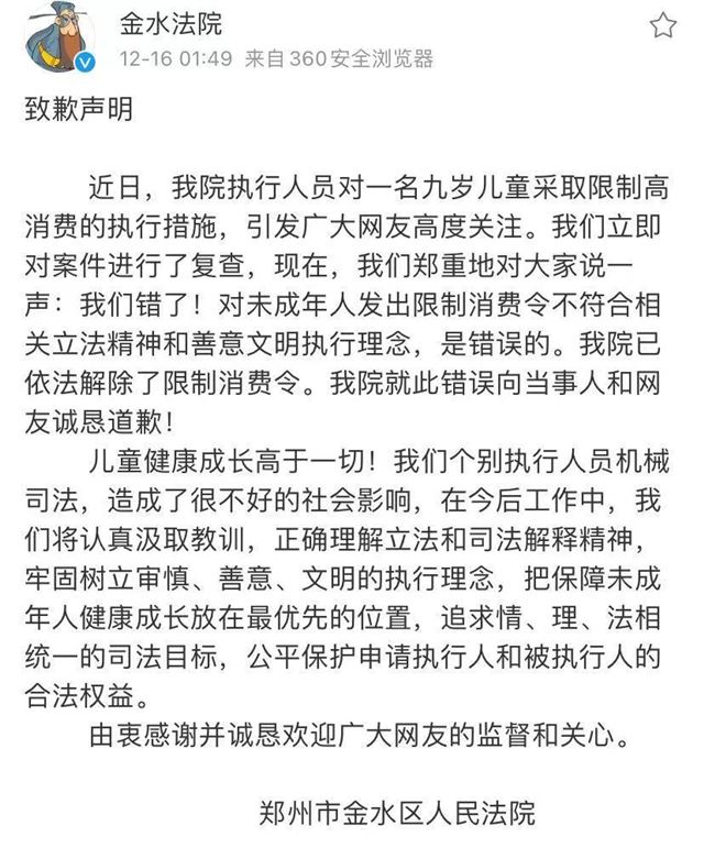 针对此事,郑州市金水区法院12月16日凌晨发布回应称,近日,法院执行人员对一名九岁儿童采取限制高消费的执行措施,引发广大网友高度关注。法院立即对案件进行了复查,现在,法院郑重地对大家说一声:我们错了!发出限制消费令不符合相关立法精神和善意文明执行理念,是错误的。法院已依法解除了限制消费令。对未成年人我院就此错误向当事人和网友诚恳道歉。