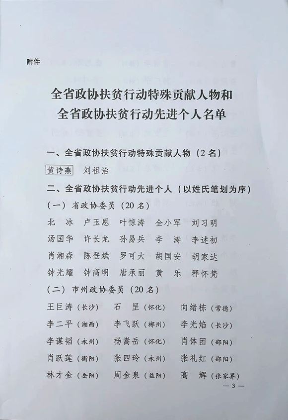 ▲胡国安委员被授予“湖南省政协扶贫行动先进个人”光荣称号