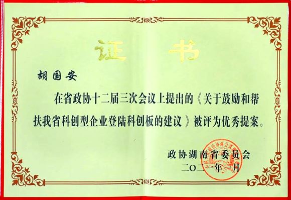▲胡国安委员2020年省政协提案《关于鼓励和帮扶我省科创型企业登陆科创板的建议》被政协湖南省委评为“优秀提案”