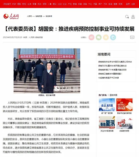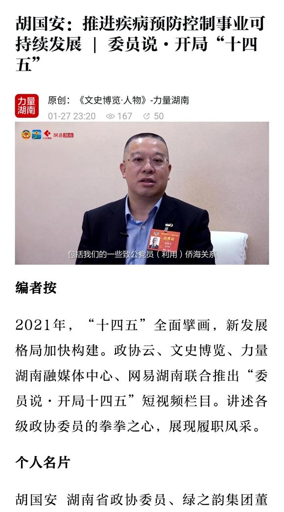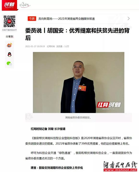 会议期间,胡国安委员广泛同各界别委员们分别围绕省委、省政府的中心工作,聚焦湖南改革发展大局和人民群众普遍关心的重点问题,进行深入探讨和交流。此次会议,胡国安委员向省政协提交了《依托中医药产业,推进我省中医医院治未病中心建设》和《关于进一步推进我省疾病预防控制事业发展的建议》两份提案。《关于进一步推进我省疾病预防控制事业发展的建议》提案建议我省探索和建立基本公共卫生服务项目、分级诊疗、家庭医生签约服务与慢性病预防控制相融合的创新型疾病防控体系。《关于依托中医药产业、推进我省中医医院治未病中心建设的建议》提案建议在我省范围内大力推动公众急救普及和急救体系建设之外,牢固树立防重于治的理念,加快各级中医医院治未病中心建设。胡国安委员2020年提交的政协提案《关于鼓励和帮扶我省科创型企业登陆科创板的建议》内容紧扣当前焦点热点话题,受到与会委员的广泛认同,被政协湖南省委员会评为“优秀提案”,引发多家新闻媒体聚焦报道。人民网、中国经济网、湖南卫视、湖南经视、搜狐、凤凰、腾讯、网易、今日头条、红网、时刻新闻、力量湖南、星辰在线、《湘声报》等多家媒体先后对胡国安委员或提案进行了采访报道。