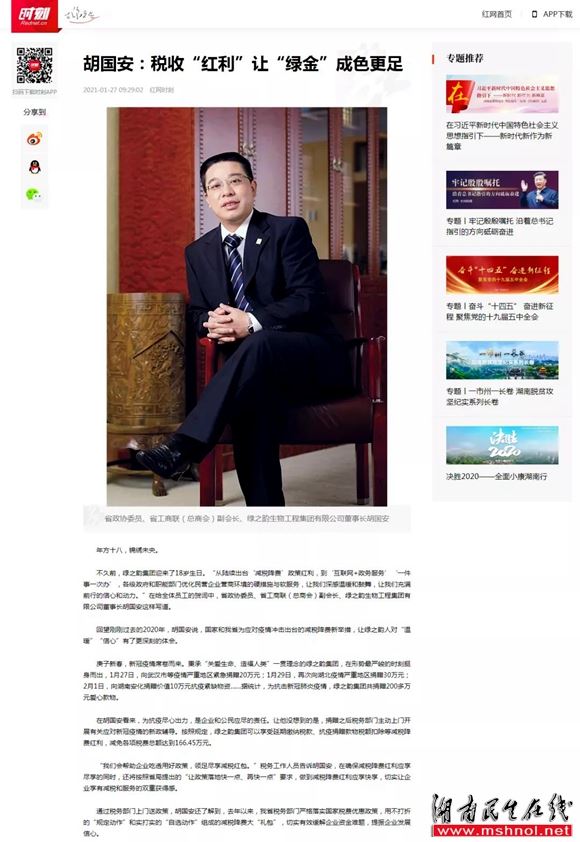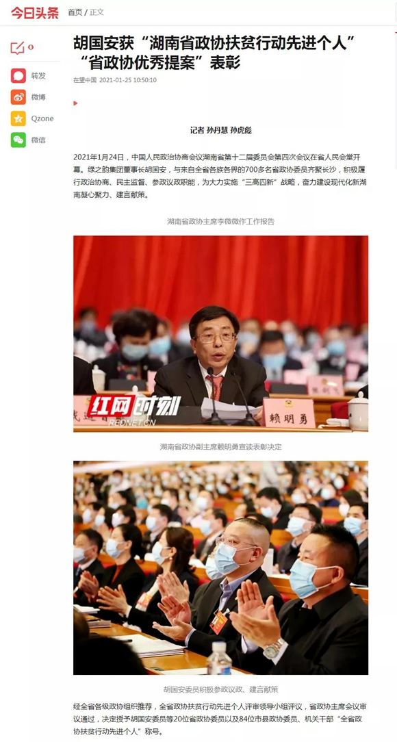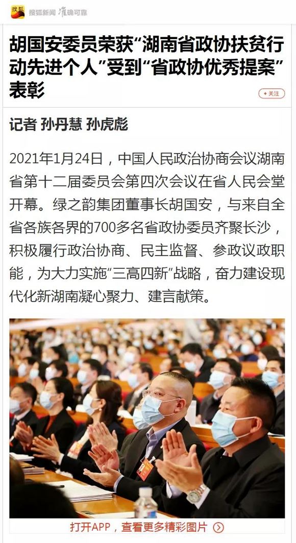 “十三五”收获满满,“十四五”豪情满怀。2021年1月24-28日,中国人民政治协商会议湖南省第十二届委员会第四次会议在长沙胜利召开。湖南省政协委员、绿之韵集团董事长胡国安与来自全省各族各界的700多名省政协委员齐聚长沙,积极履行政治协商、民主监督、参政议政职能,为大力实施“三高四新”战略,奋力建设现代化新湖南凝心聚力、建言献策。