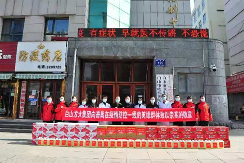 连日来,白山方大集团党委组织党员志愿者、青年志愿者走进市交警支队、市医院、市疾控中心、市公交公司、市环卫处、市公安局红旗分局、街道、社区等41家单位,向奋战在疫情防控一线的英雄群体捐赠了口罩19.6万个、消毒液990桶、方便面760箱、矿泉水680箱、八宝粥550箱、手套2000副。