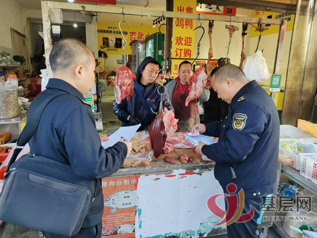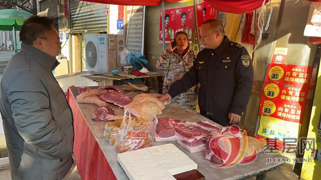 当天早上7点,联合检查组对杉山镇的肉类销售门店和摊点进行了全覆盖检查。每到一处,执法人员都详细询问肉类经营户的进货渠道和索证索票情况,仔细查看在售肉类产品是否有“两证两章”,即动物产品检疫合格证、肉品品质检验合格证、动物检疫验讫印章、肉品品质检验验讫印章,严厉查处销售来源不明、未经检验检疫或检验检疫不合格肉类产品等违法违规行为。此外,联合检查组还向经营户宣传《中华人民共和国食品安全法》等相关法律法规,要求经营户切实履行食品安全主体责任,认真把好进货查验关,杜绝不合格肉品流入市场、流向餐桌。