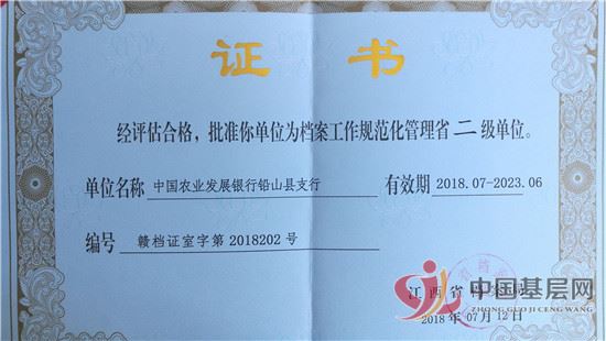 中国基层网铅山7月21日消息 (通讯员 潘世林)近日,农发行江西省铅山县支行档案综合管理达标工作以93分的成绩,通过了省市县档案局组织的考评验收,被授予“档案工作规范化管理省二级单位”荣誉称号,成为全市农发行系统唯一一家达到江西省机关档案管理二级达标单位。