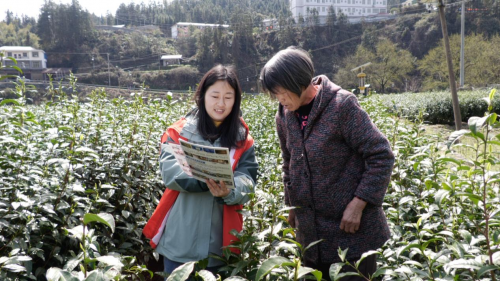 采茶现场,志愿者腰系小竹篓穿梭在茶林里。一捏一提,一芽一叶便落进了竹篓里。志愿者一边采摘茶叶,一边向茶农宣讲党的民族政策和乡村振兴战略。