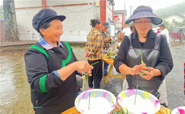 活动现场,民族村干部、驻村干部及村民提前浸泡好的糯米和洗净的粽叶等物料,井然有序地摆放在桌面上。项目职工和村民纷纷自发组成小组,集结在一起,共同参与到这一传统佳节的庆祝活动中。经验丰富的“阿妈、阿姐”担任老师一职,“把粽叶挽成漏斗状,再放些糯米,然后用粽叶把米包住,用手指按住绳子的一头,一缠一系,粽子就包好了!”
